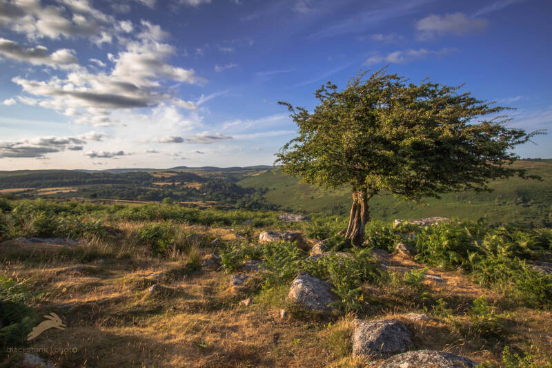 The classic and probably most photographed view lies to the east of the main outcrop and slightly down a gentle slope. Here, a lone Hawthorn stands proudly in defiance of the howling moorland winds and makes perfect foreground interest for vista beyond which can be either Dartmeet to Fernworthy forest (if shot facing north) or Sharp Tor and the Dart Valley (if shot facing east). Both make beautiful scenes. Like many moorland trees, the trunk is gnarled and twisted and makes a great focal point. The light really matters at this location. Generally this side works best at dawn as the sun gets lost behind the rocks as the afternoon progresses, leaving the whole scene in shade. You can shoot in the evening during high summer but you need to time the light carefully. Personally (and depending on the exact position of the rising sun) I find shooting north produces the best results at dawn, with the golden hour light warming the trunk and highlighting it’s features.
